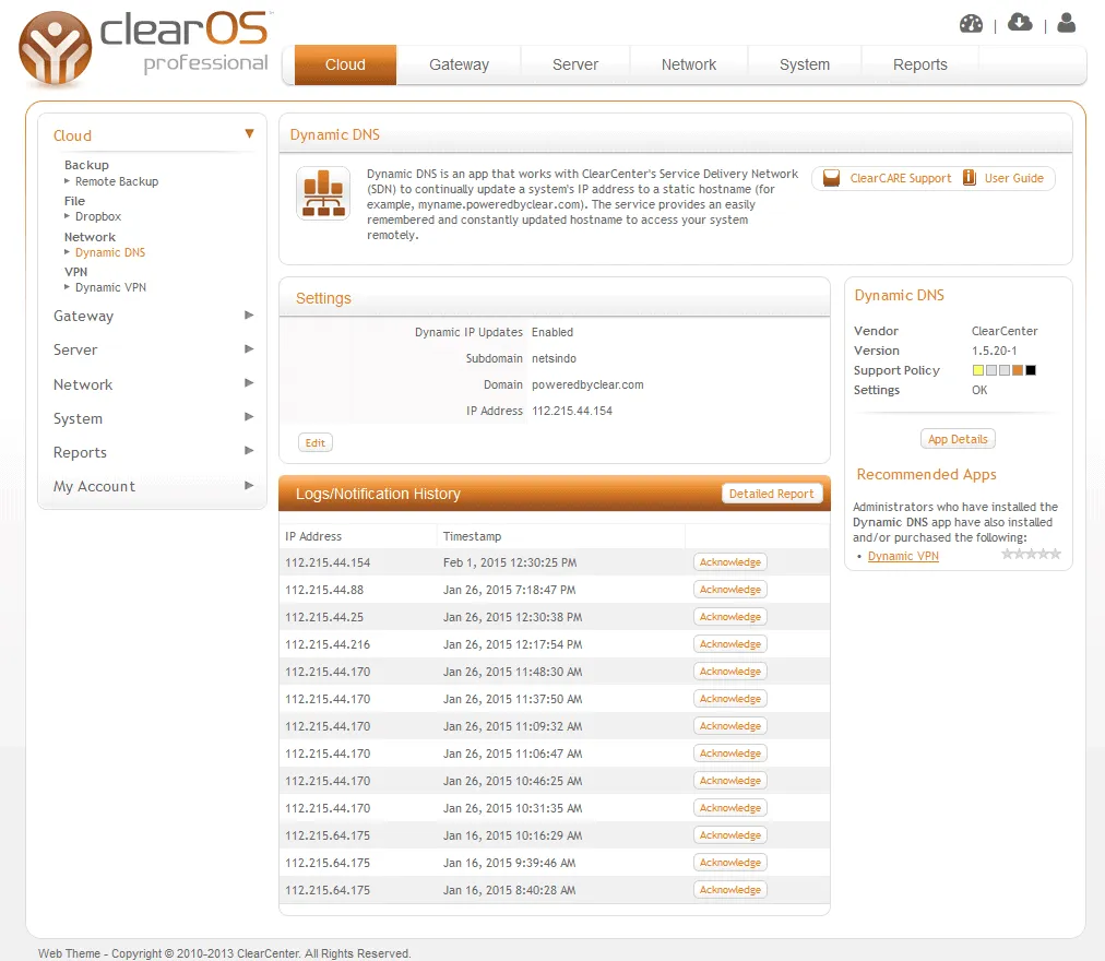 DynamicDNS adalah apps ClearOS Professional yang berfungsi memetakan IP Address publik Server ke nama domain. Dengan apps ini, ClearOS dapat diakses dengan mudah melalui domain meskipun IP Address nya bersifat dinamis atau berubah-ubah.