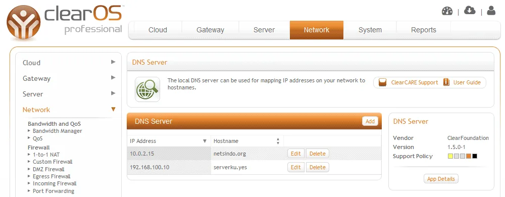 Dua apps di ClearOS Professional yang berguna untuk pengaturan DNS di ClearOS adalah DynamicDNS dan Lokal DNS.