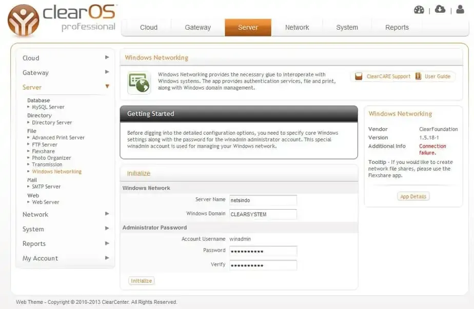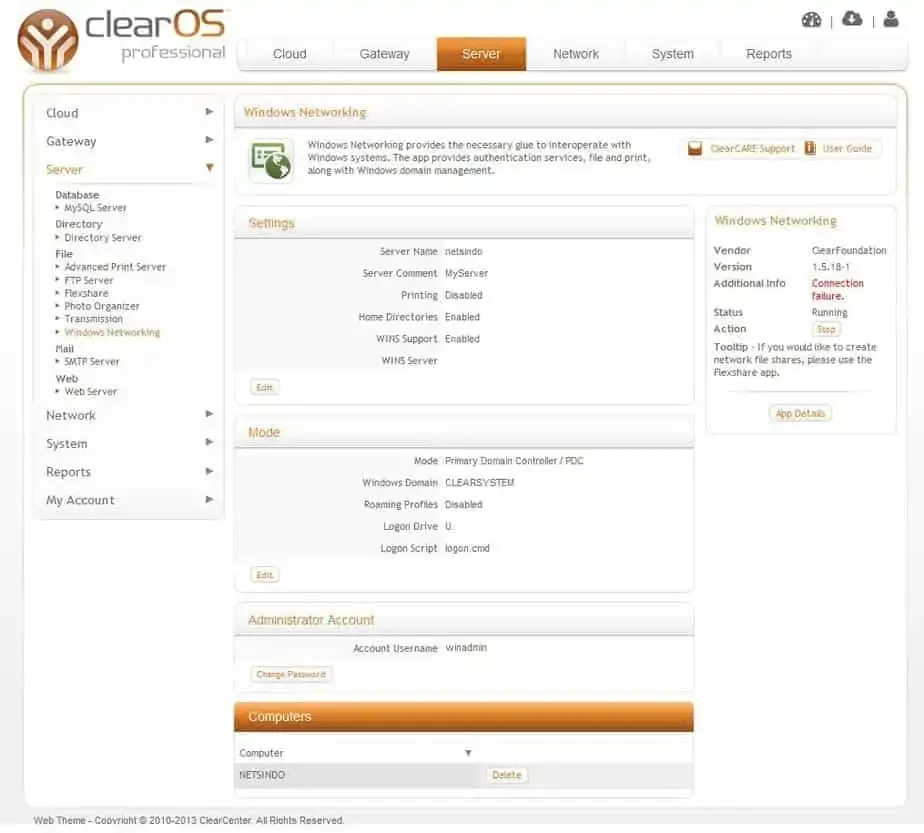 clearos_professionalWindows Networking adalah salah satu fitur di ClearOS Professional yang berfungsi mengkoneksikan Sistem Operasi ClearOS dan Microsoft Windows, melalui Samba.