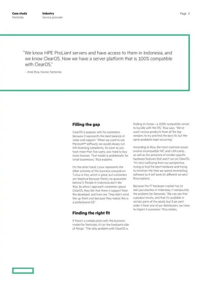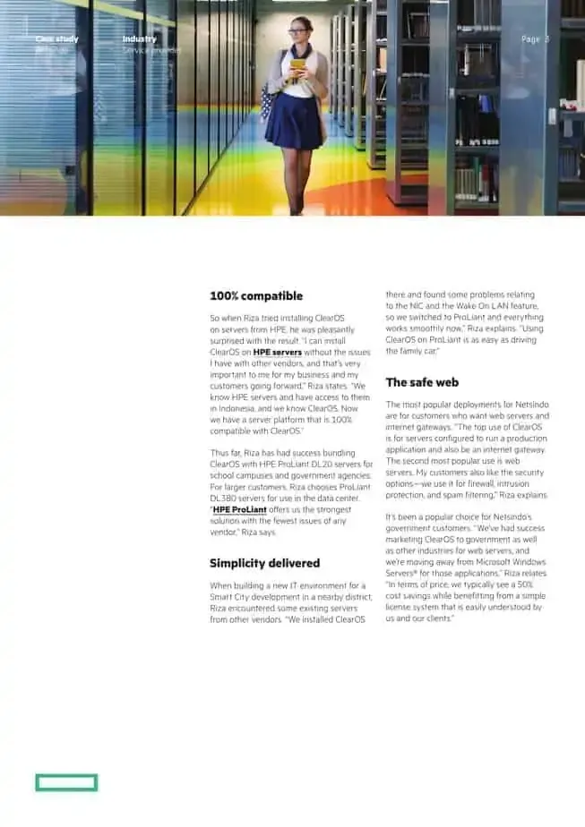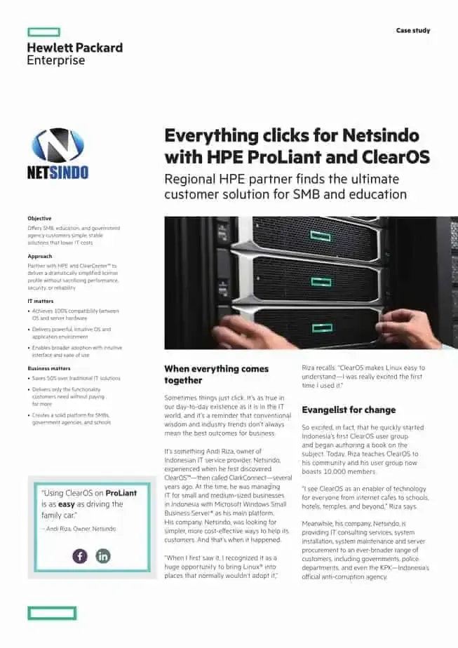 The collaboration between HPE and ClearCenter in supporting the innovation of ClearCenter products such as ClearOS, ClearVM, ClearNode, ClearGlass, etc. provides a great opportunity to meet Netsindo’s client needs. The combination of stable and secure software with reliable and powerful hardware is the dream of all System Integrators.