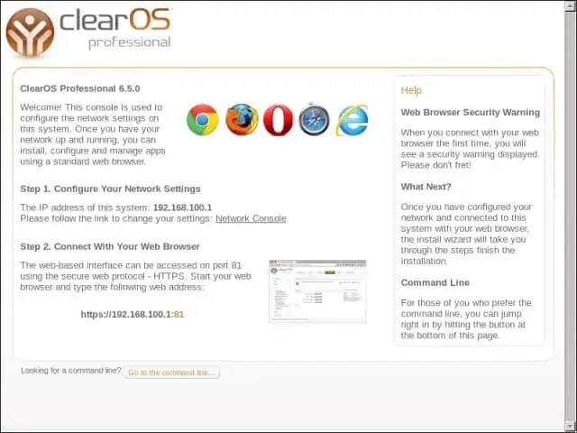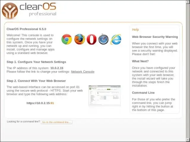 2. Tampilan awal setelah proses inisialisasi selesai. Dari sini, anda akan diminta untuk melakukan konfigurasi jaringan dan IPÂ address di ClearOS Professional. Lanjutkan dengan klik tautan Network Console.