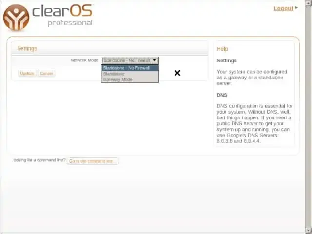 – Settings : untuk memilih mode ClearOS Professional, yaitu Standalone , Standalone No firewall, dan Gateway.