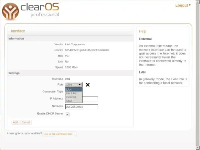 Tipe interface yang berhubungan dengan jaringan diluar sistem ClearOS, misalnya terhubung ke internet atau ke kelompok jaringan lain.