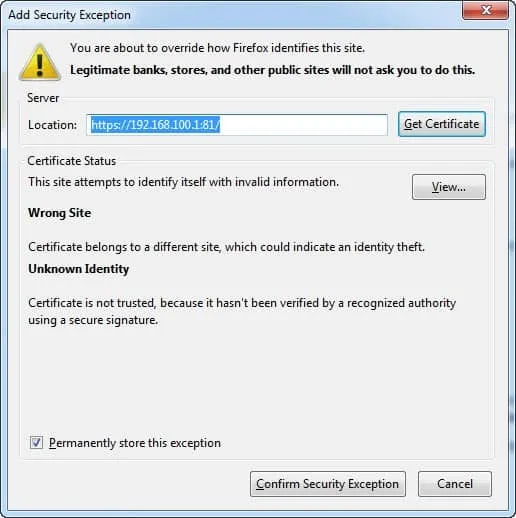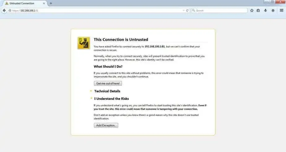 3. Dalam contoh, kami masukkan https://192.168.100.1:81 . Klik I Understand the Risks kemudian Add Exception..
